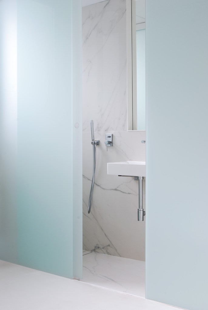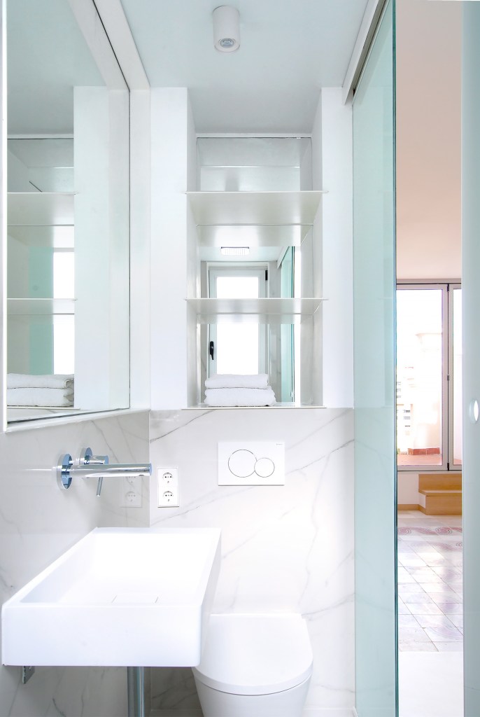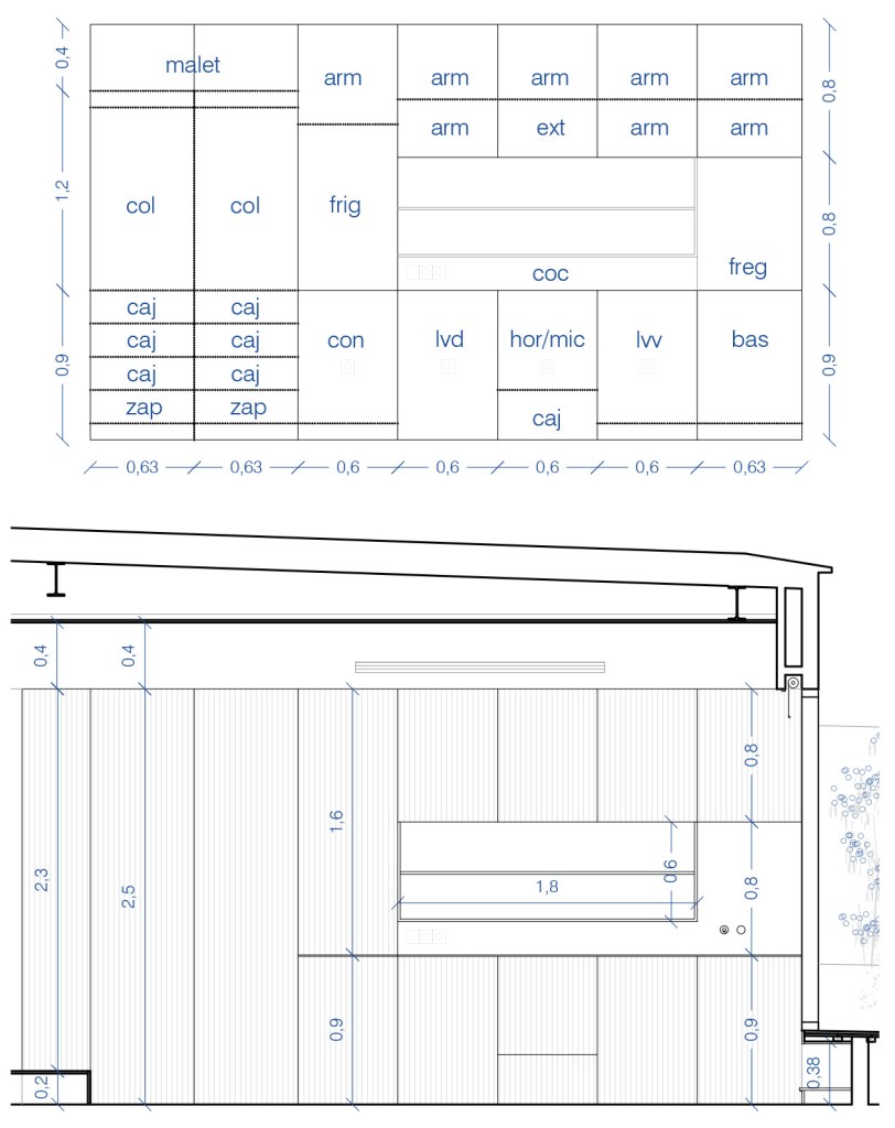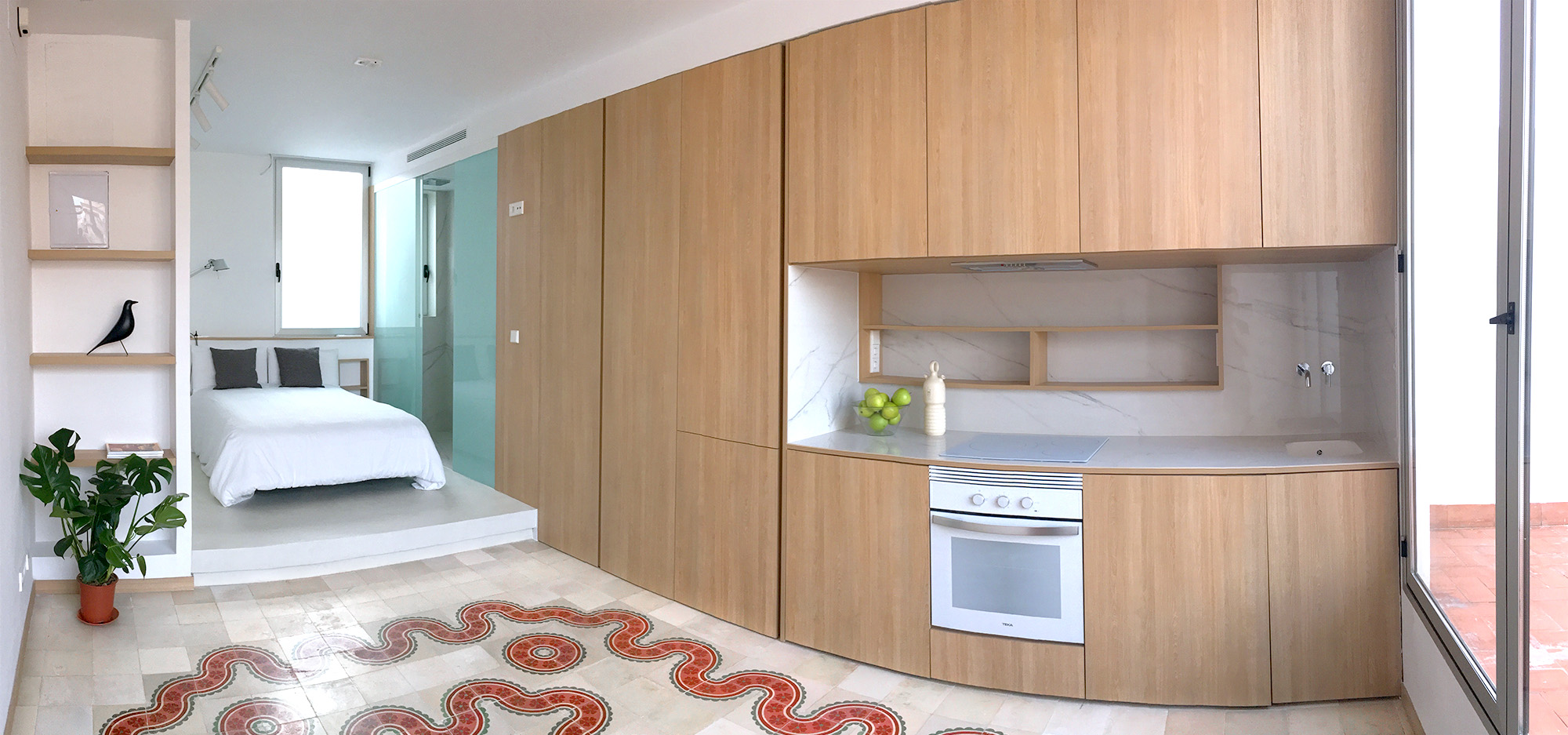 Las reducidas dimensiones de la vivienda original supusieron un reto a la hora de incorporar todos los elementos necesarios sin invadir el espacio principal. Para ello se definió con detalle la banda adosada a la medianera incorporando en ella el baño, la cocina y el espacio de almacenaje, así como las instalaciones de fontanería, saneamiento, electricidad y climatización.