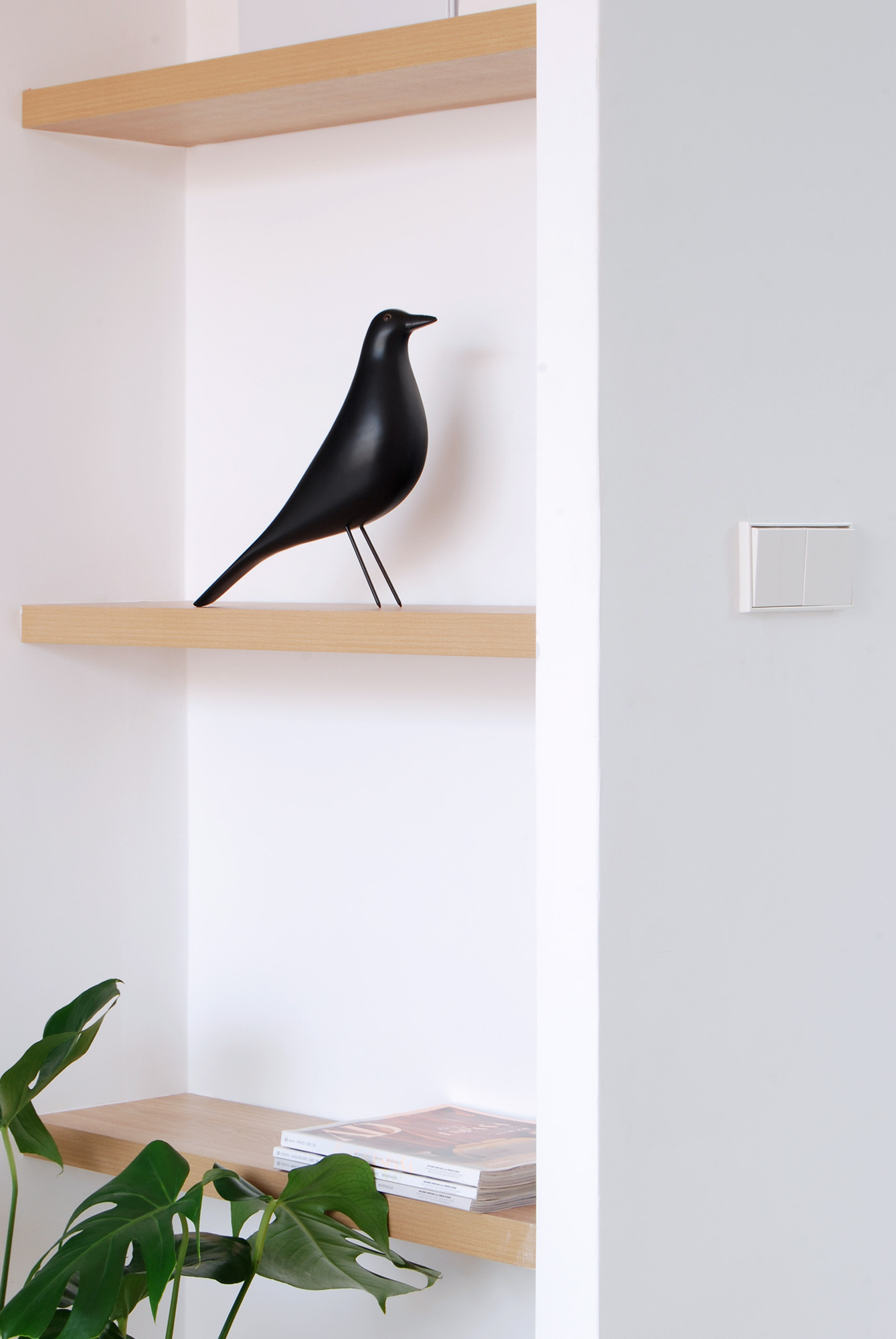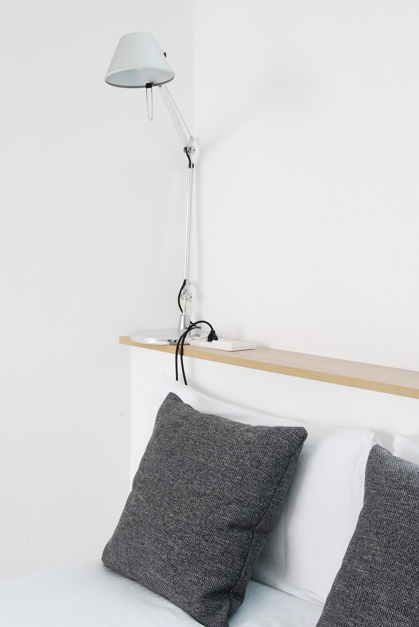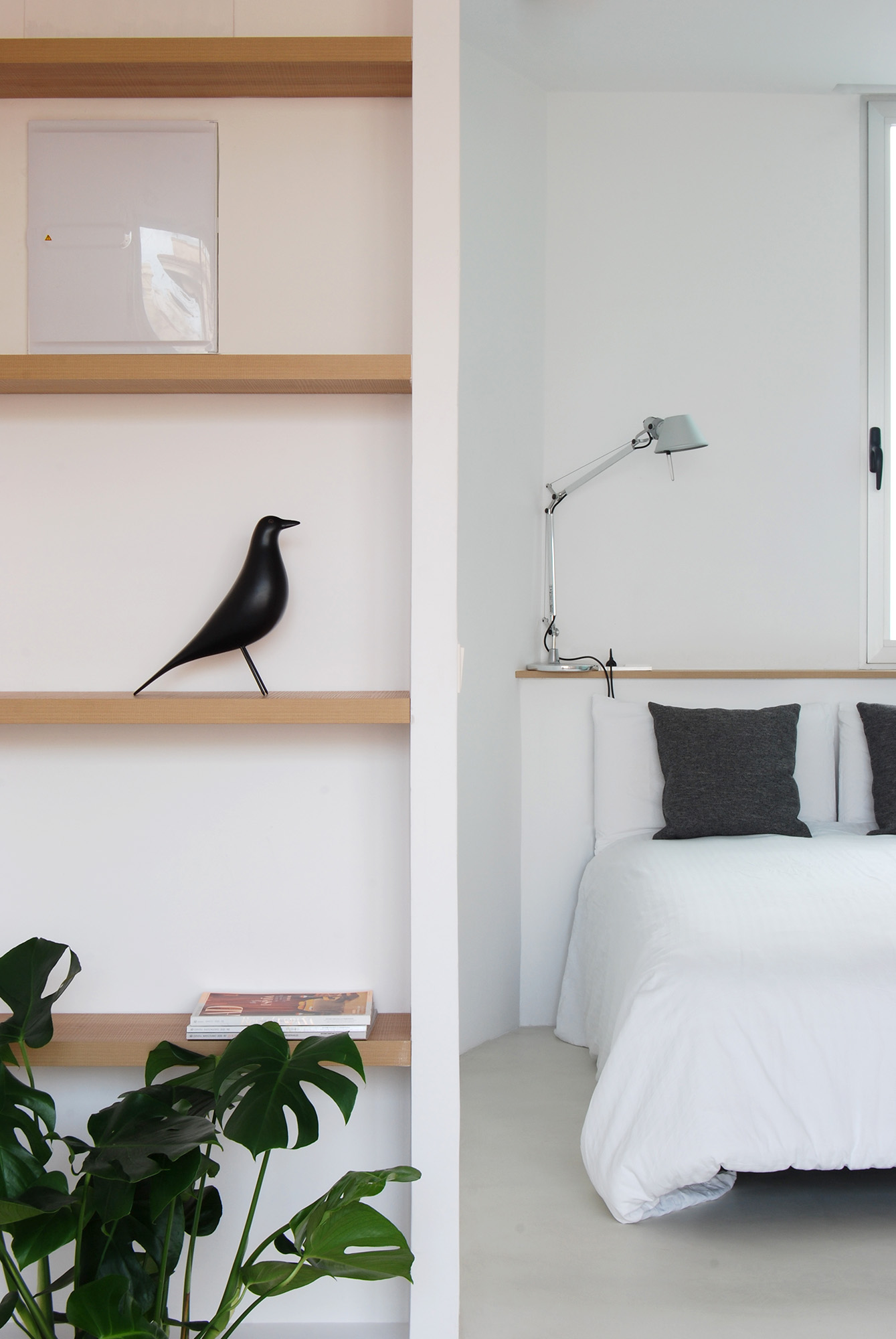 Las reducidas dimensiones de la vivienda original supusieron un reto a la hora de incorporar todos los elementos necesarios sin invadir el espacio principal. Para ello se definió con detalle la banda adosada a la medianera incorporando en ella el baño, la cocina y el espacio de almacenaje, así como las instalaciones de fontanería, saneamiento, electricidad y climatización.