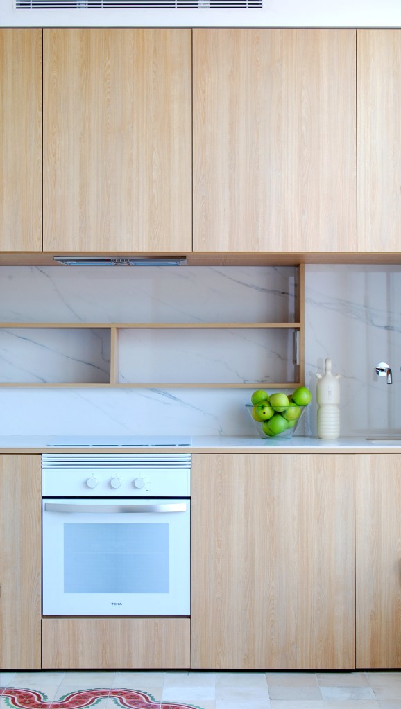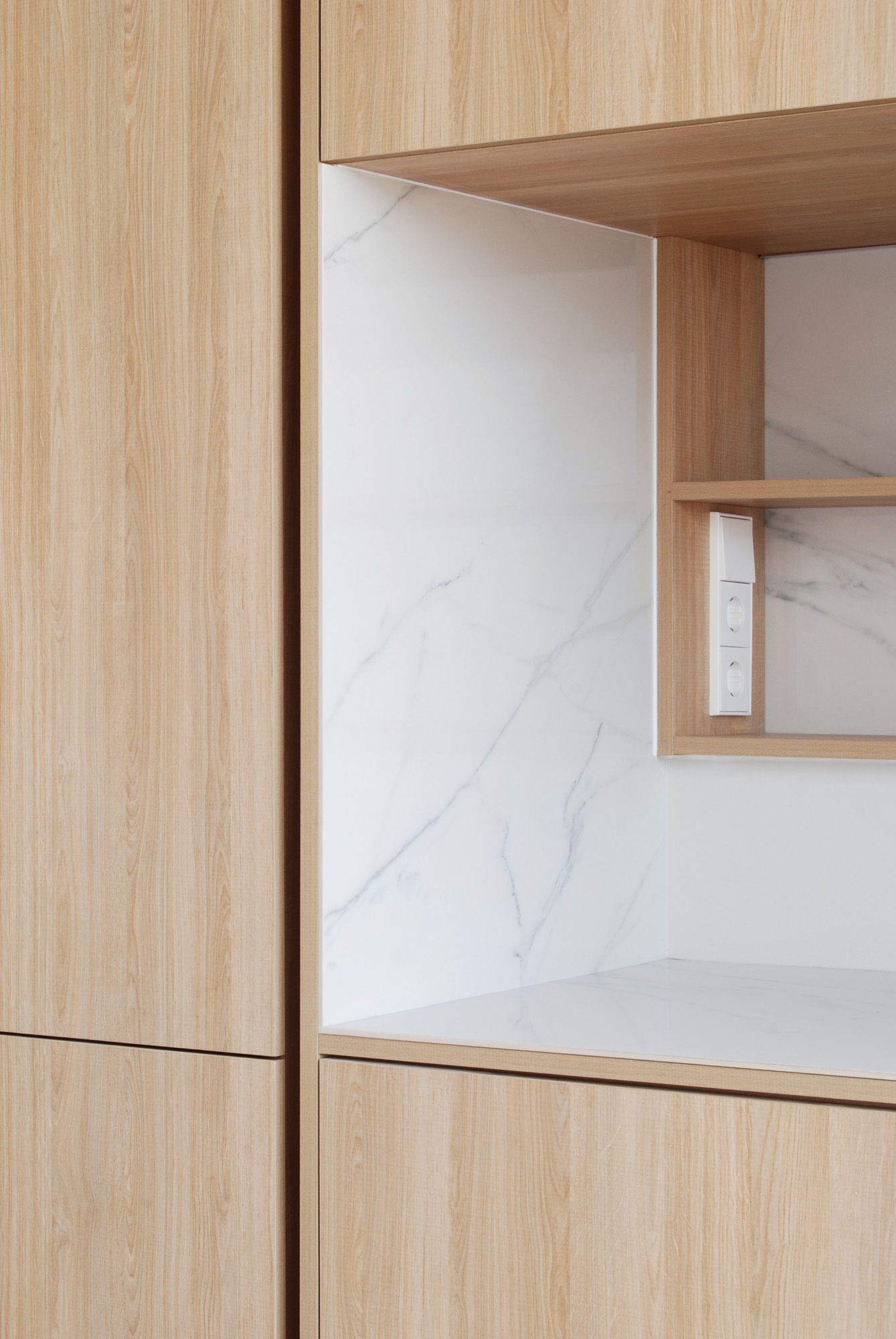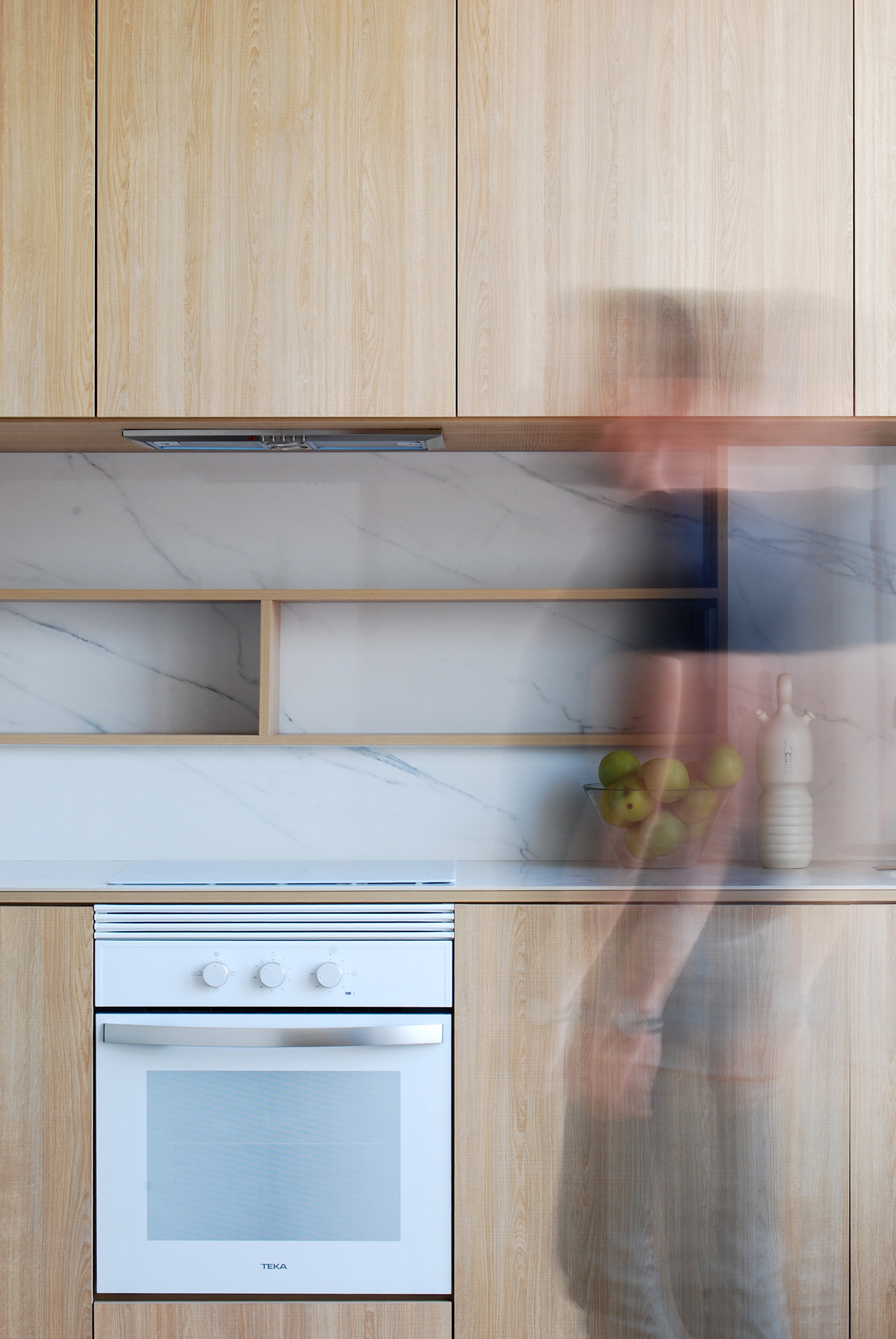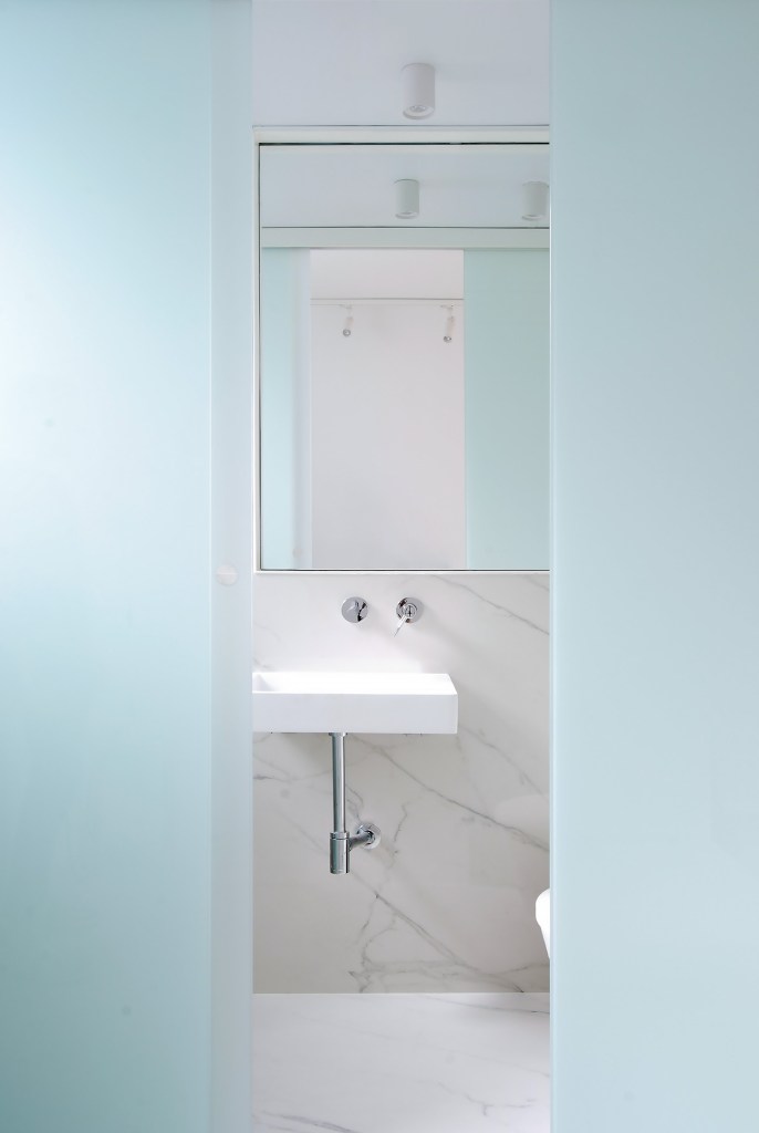 La materialidad refuerza la estrategia del proyecto. Por un lado, se enfatiza el carácter autónomo de la banda de servicio panelándola con tablero chapado al exterior y piezas porcelánicas de gran formato al interior.