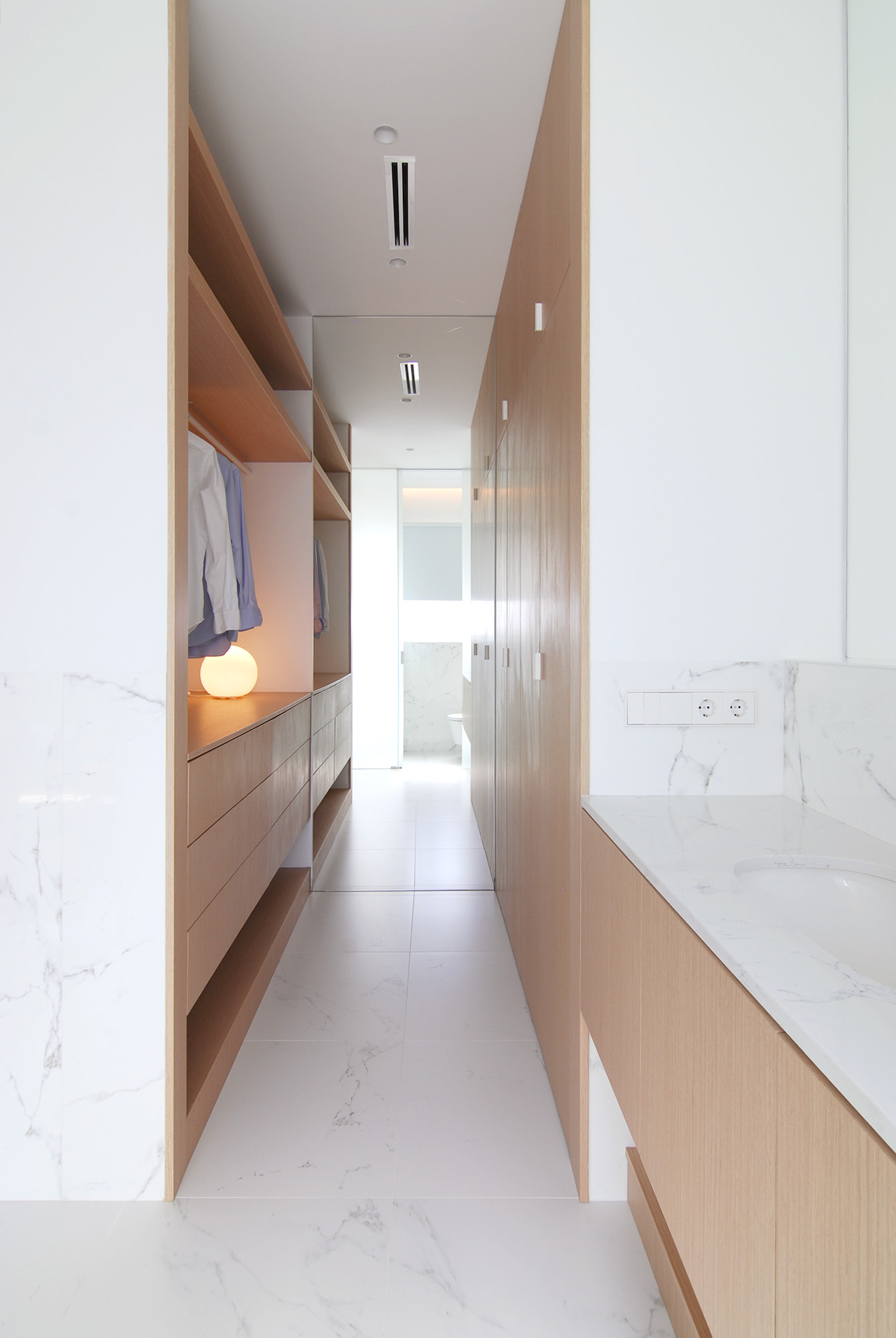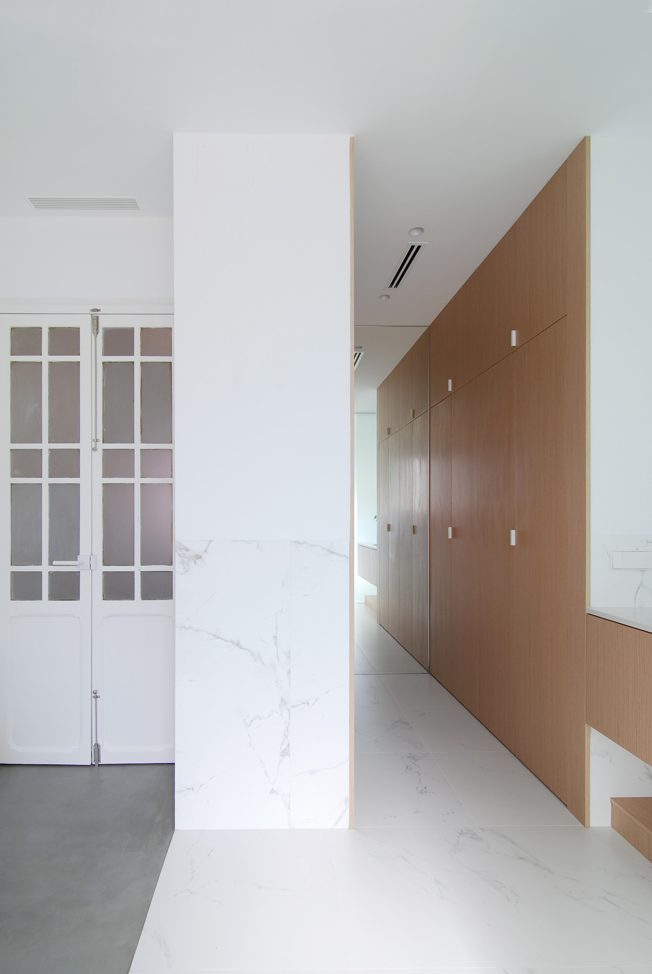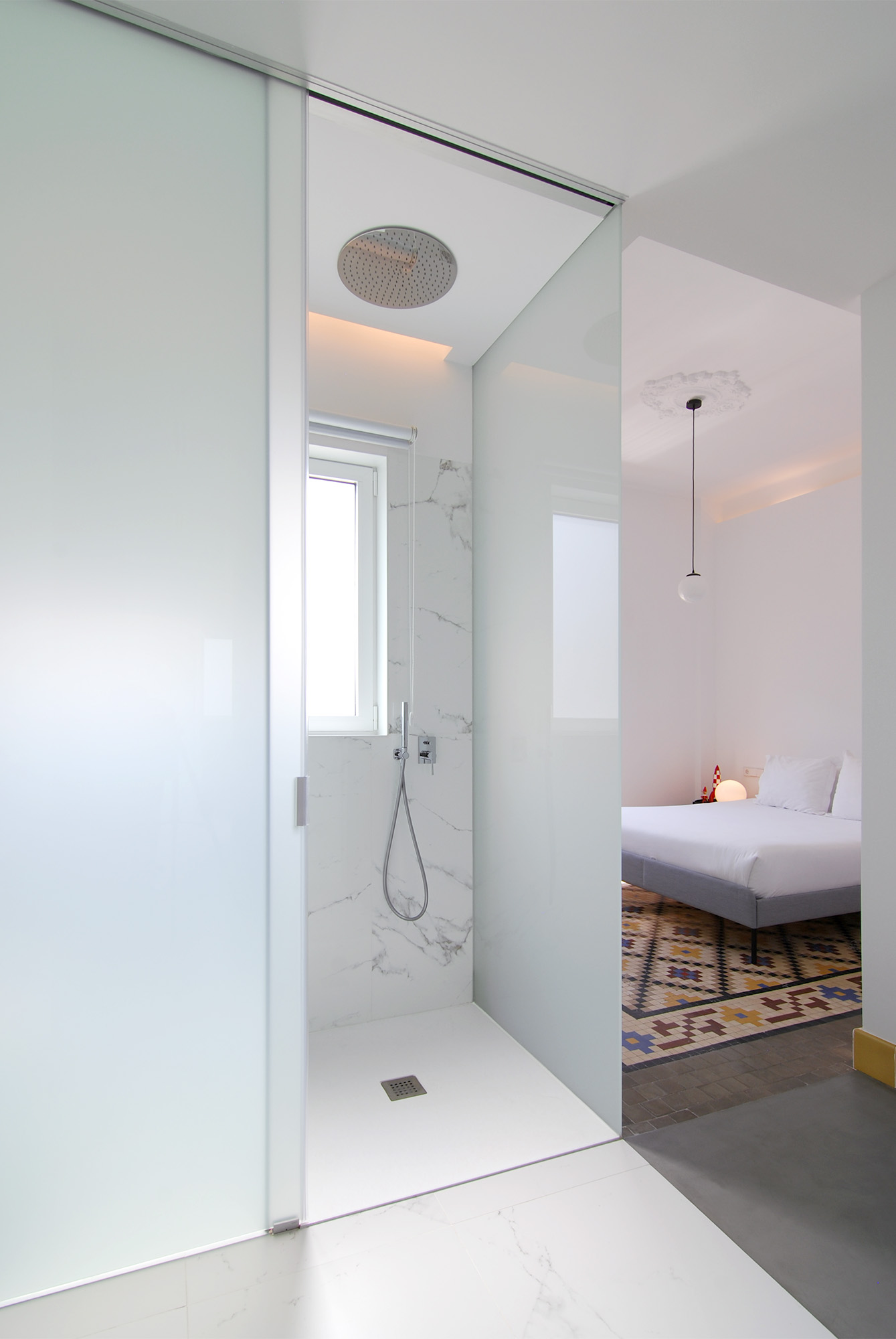 Para ello el proyecto construye un gran espacio público donde los suelos originales son bañados por la luz que se cuela tras el mirador a la ciudad, y una zona privada hacia el patio de manzana donde de nuevo la luz fluye entre dormitorio, baño y vestidor.