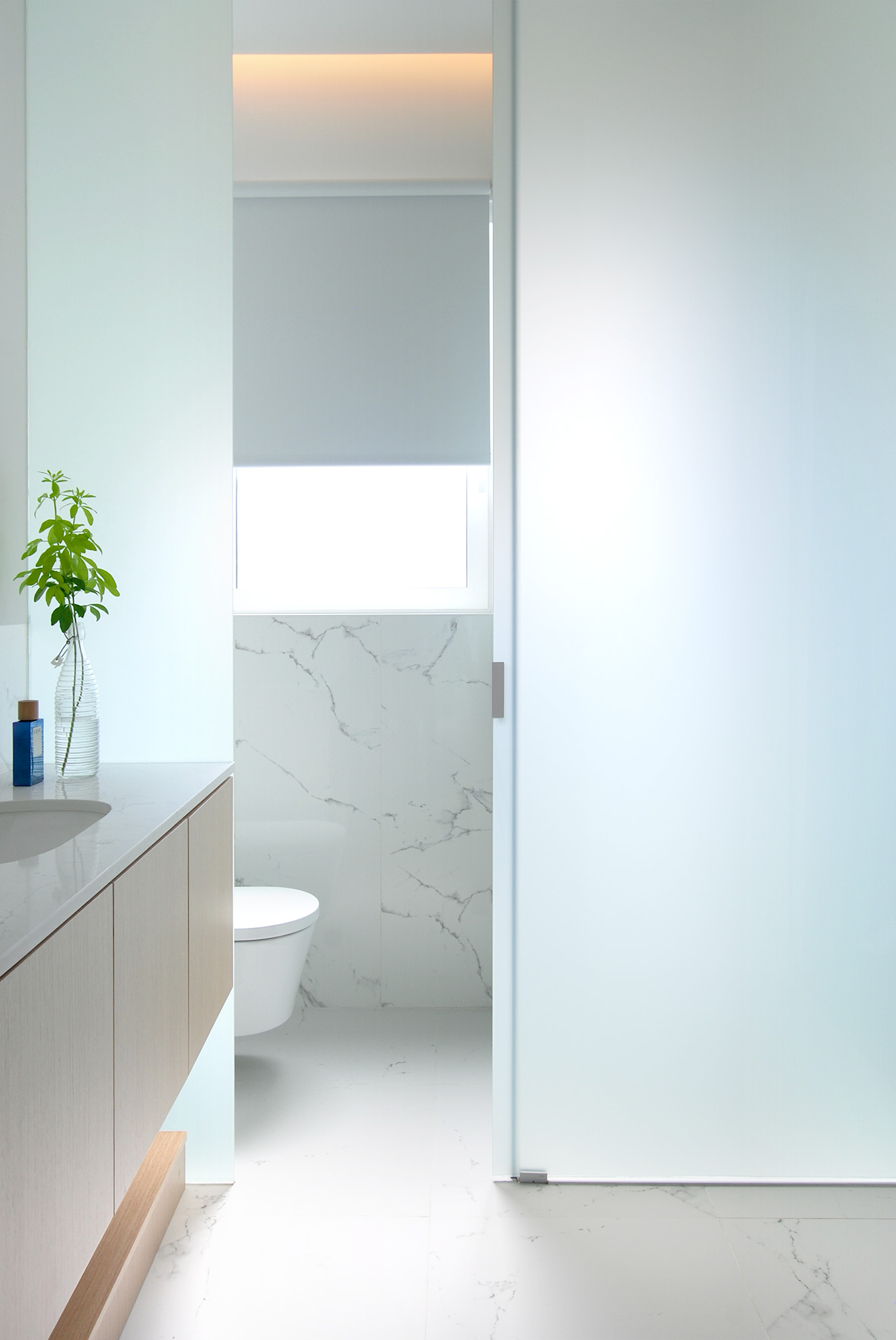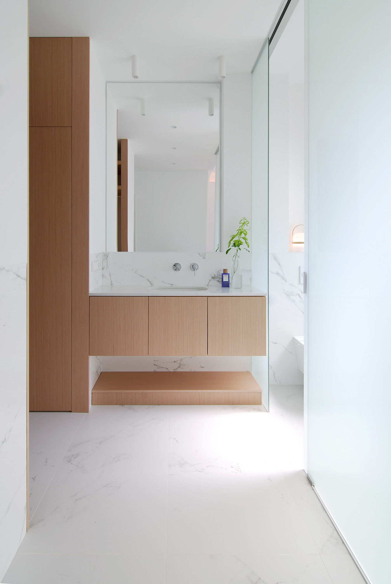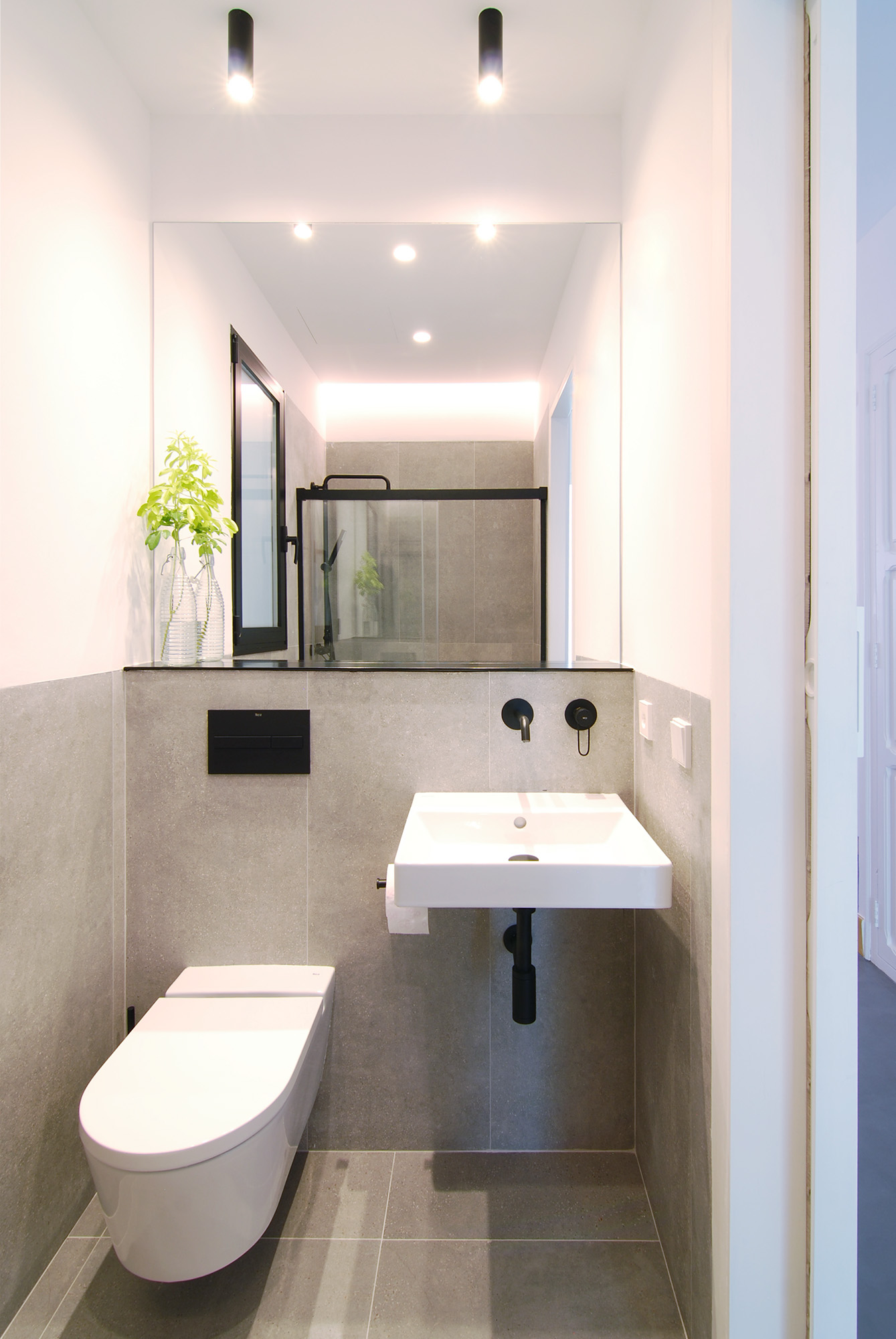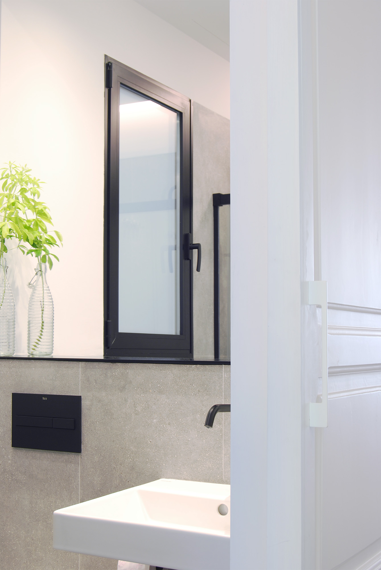 Para ello el proyecto construye un gran espacio público donde los suelos originales son bañados por la luz que se cuela tras el mirador a la ciudad, y una zona privada hacia el patio de manzana donde de nuevo la luz fluye entre dormitorio, baño y vestidor.