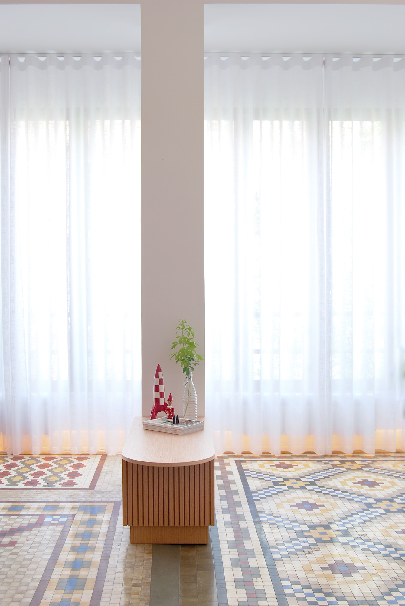 Esta historia única se encierra en los suelos de la vivienda de Nacho y el proyecto busca que quien visite la casa pueda escucharla. Además de su restauración, los trasdosados de fachada se interrumpen a 15 cm del suelo para iluminarlos, el rodapié cerámico lo enmarca recuperando sus colores y el resto de elementos se plantean como un lienzo discreto para no competir con el verdadero protagonista.